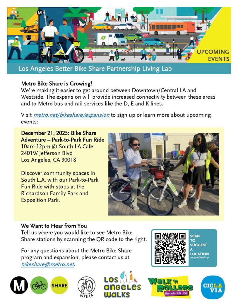 This program is funded by People for Bikes as part of the Better Bike Share Living Lab Partnership. Program partners include Metro, Bicycle Transit Systems, Bike LA, os Angeles Walks and CicLAvia.