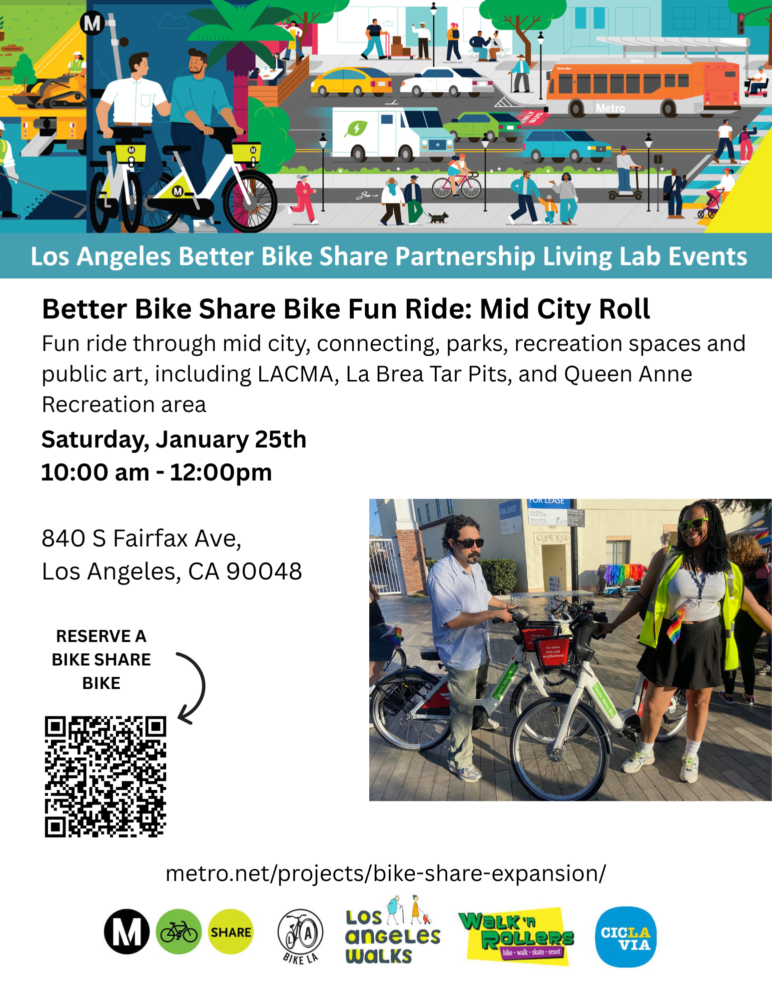 Committed to the equitable expansion of Metro Bike Share (MBS), the Los Angeles Living Lab Coalition, funded by the Better Bike Share Partnership (BBSP), includes BikeLA, Los Angeles Walks, Walk ‘n Rollers, CicLAvia, and Metro. The coalition partners will work together to inform this expansion effort, with the goal of fostering excitement for Metro Bike Share in diverse communities across Los Angeles.
